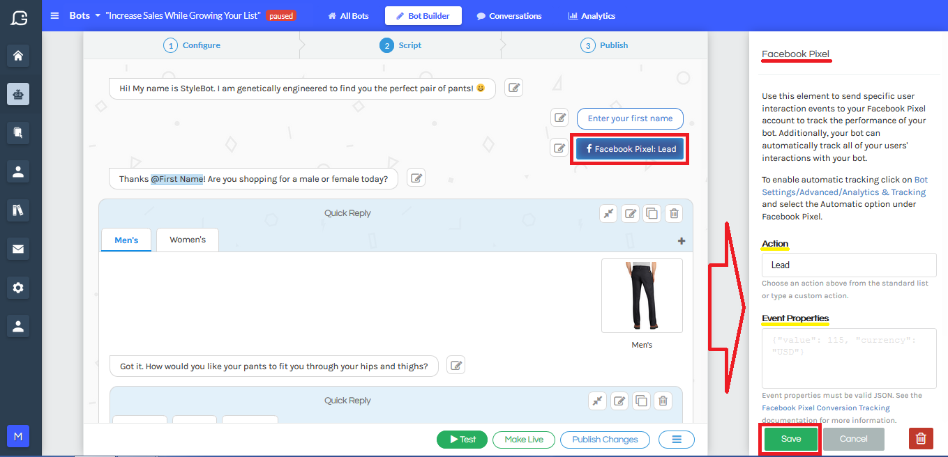 If you've opted on the Custom selection, you will need to designate the user interaction you want to track. Close Bot Settings by clicking Save and you will be brought back to the bot builder. Drag the Facebook Pixel button into your bot script directly after the user interaction you want to track.